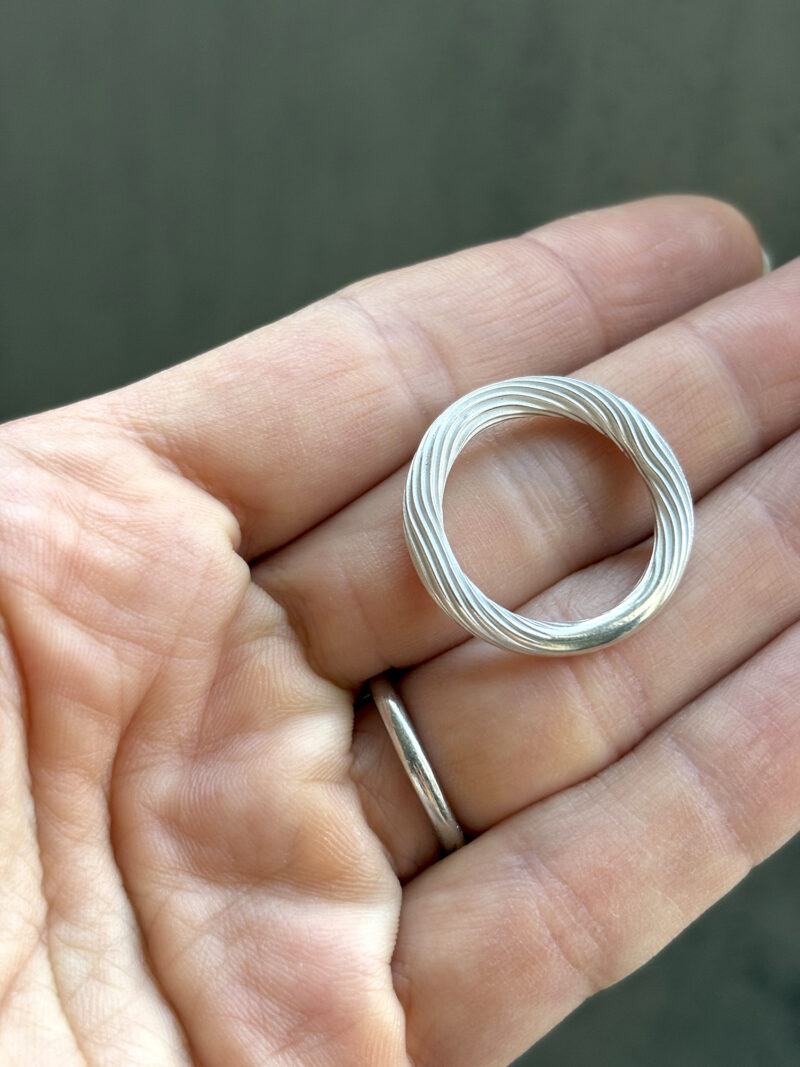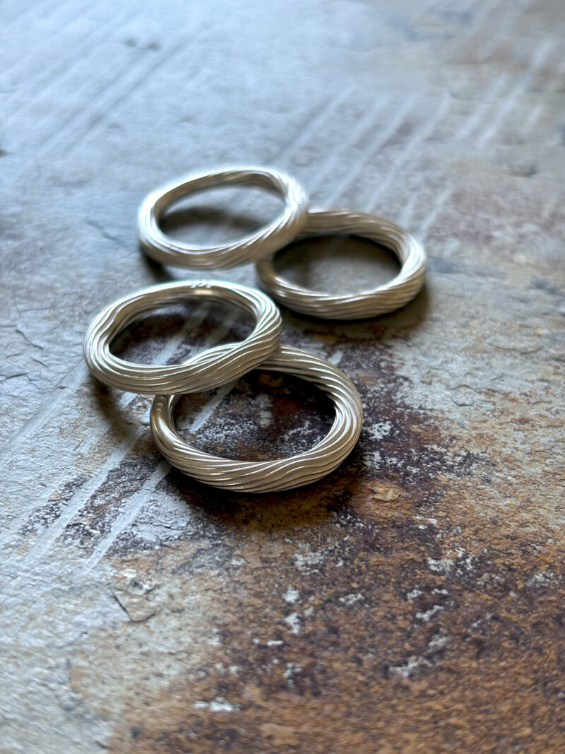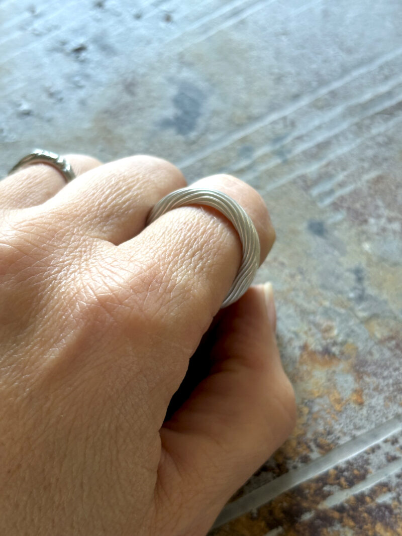 Formed from thick Argentium silver, this ring carries the signature woodgrain texture which is raw, tactile, and full of movement. The shiny peaks catches the light, revealing the unpolished white valleys created by hand and fire.